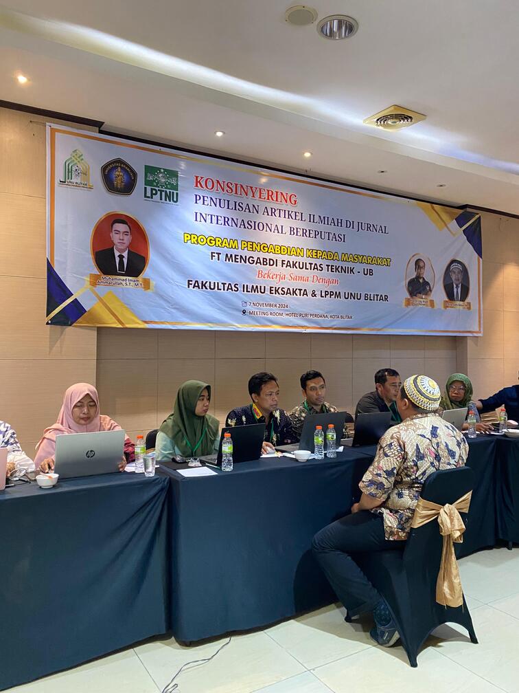 Kamis, 7 November 2024. Telah diselenggarakan Kegiatan “Konsinyering Penulisan Artikel Ilmiah di Jurnal Internasional Bereputasi” yang diselenggarakan oleh Fakultas Teknik Universitas Brawijaya (UB) dalam program pengabdian masyarakat bertajuk “FT UB Mengabdi”. Acara ini terselenggara berkat kerjasama dengan Fakultas Ilmu Eksakta (FIE) dan LPPM UNU Blitar, bertempat di Meeting Room, Hotel Puri Perdana, Kota Blitar. Program ini bertujuan untuk meningkatkan kualitas publikasi ilmiah para peserta dalam menulis artikel ilmiah di jurnal internasional bereputasi.