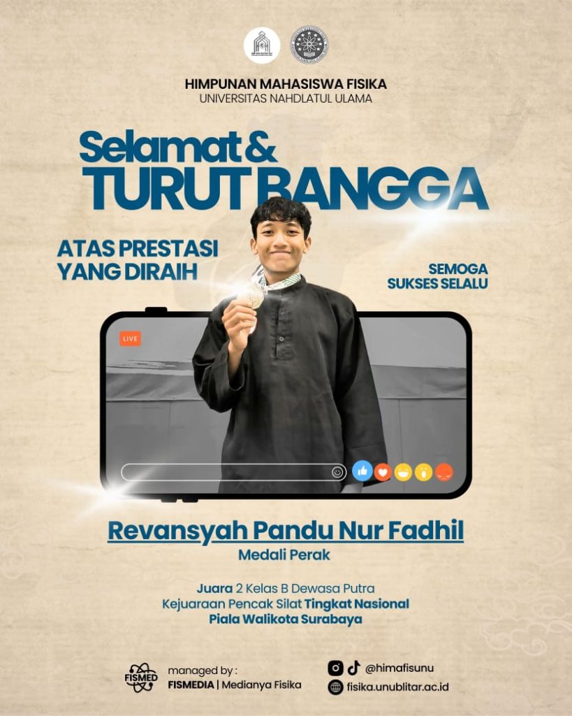 mahasiswa Program Studi Fisika, Fakultas Ilmu Eksakta, UNU Blitar Angkatan 2024, atas prestasi gemilangnya meraih Medali PERAK dalam Kejuaraan Pencak Silat Tingkat Nasional – Piala Wali Kota Surabaya yang diselenggarakan pada 16–18 Mei 2025.